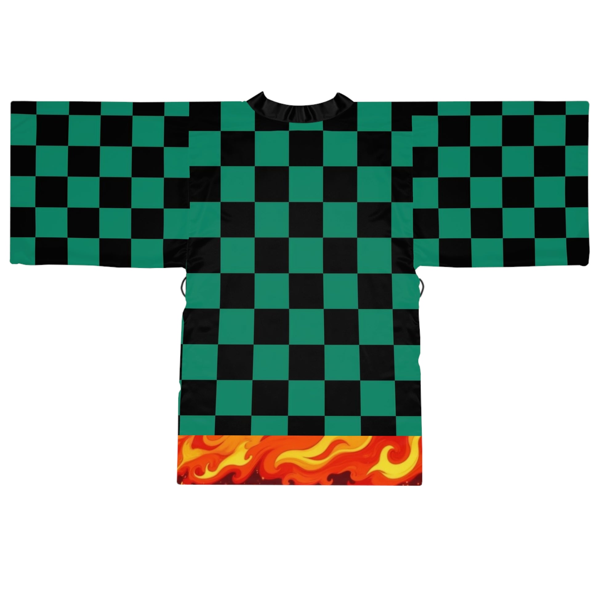 Bold and clean Tanjiro-inspired Ichimatsu print kimono robe, with a touch of the ritual dance flame, perfect for casual cosplay. This versatile robe is ideal for anime enthusiasts, cosplay lovers, and anyone looking for a unique and stylish accessory. Suitable for anime conventions, costume parties, or everyday wear.