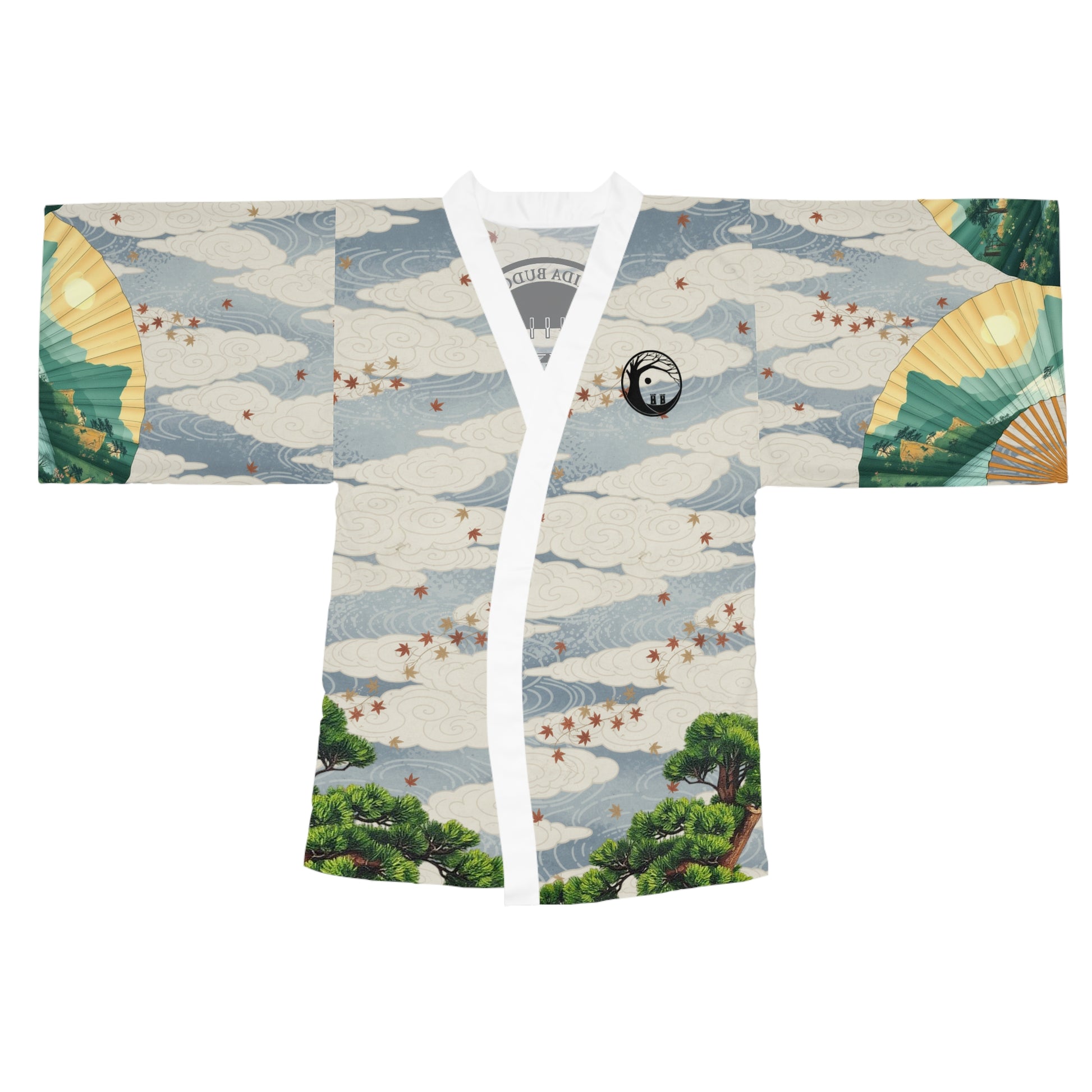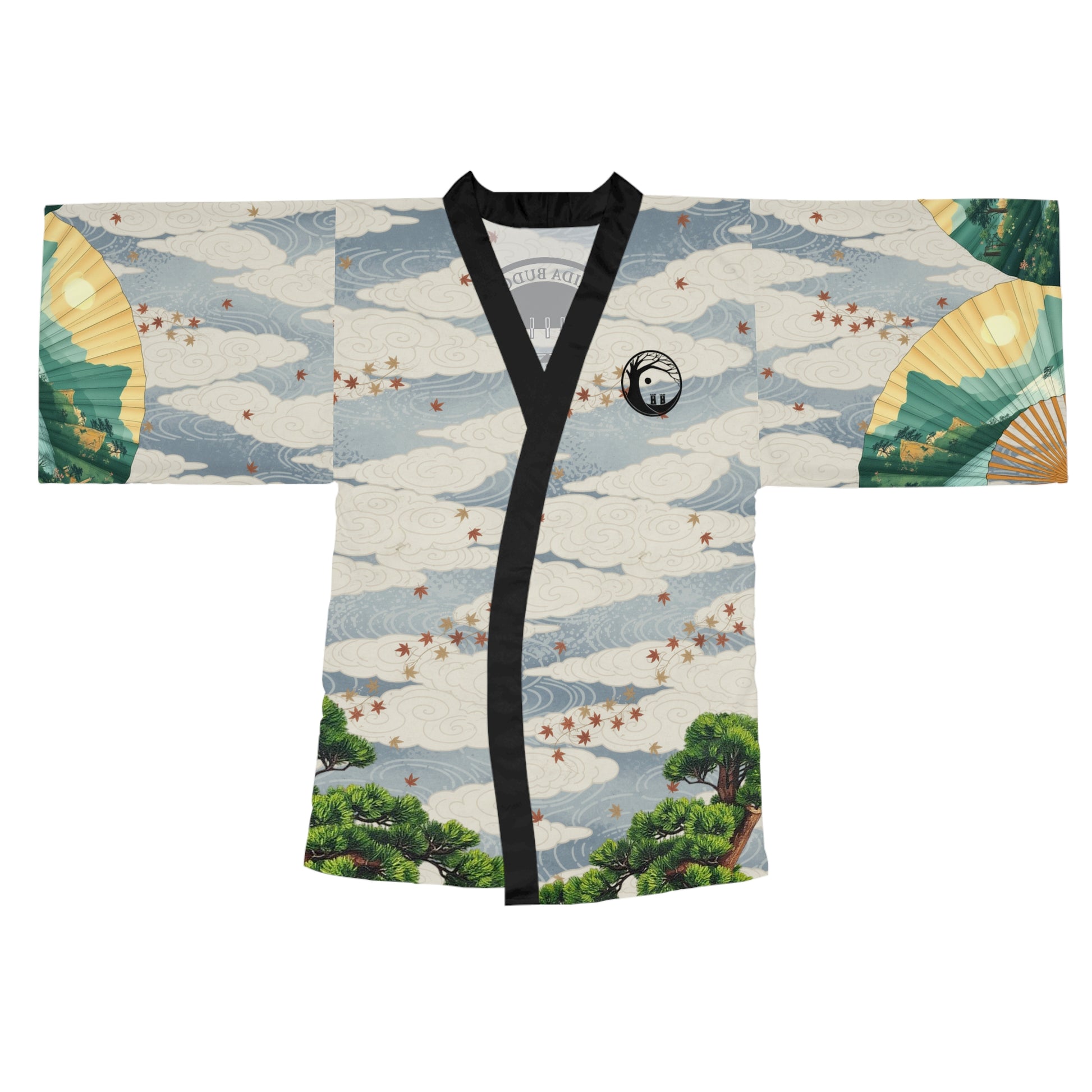 Wearable art that moves like a memory: this mid-length kimono robe blends traditional Japanese motifs—rising clouds, scattered maple leaves, stylized pines and folding fans—into a light, flowing silhouette. The airy polyester feels smooth against the skin and drapes in long bell sleeves that catch movement. Tie the belt to shape the waist, or leave it open as a layered statement over evening wear. It’s made to travel from quiet mornings at home to lively nights out, carrying a calm, crafted presence wherever you go.